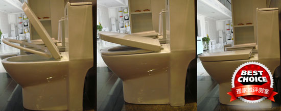 二.緩沖蓋板減少噪音,測評員現(xiàn)場測試:掀起馬桶蓋,再順勢下壓,馬桶蓋和坐墊呈現(xiàn)分離式緩緩下落,整個過程緩慢而無阻滯,說明阻尼器質(zhì)量較好。